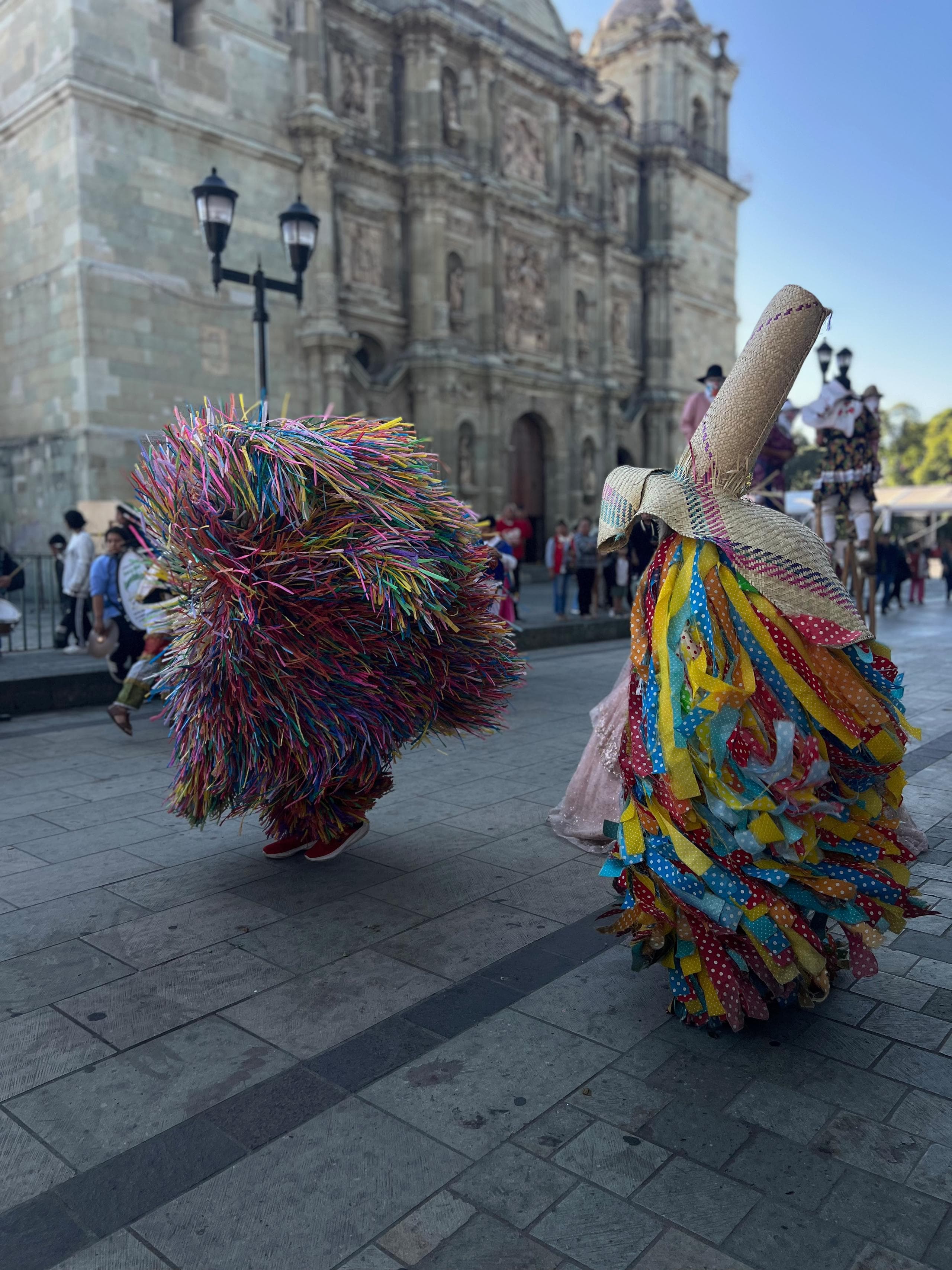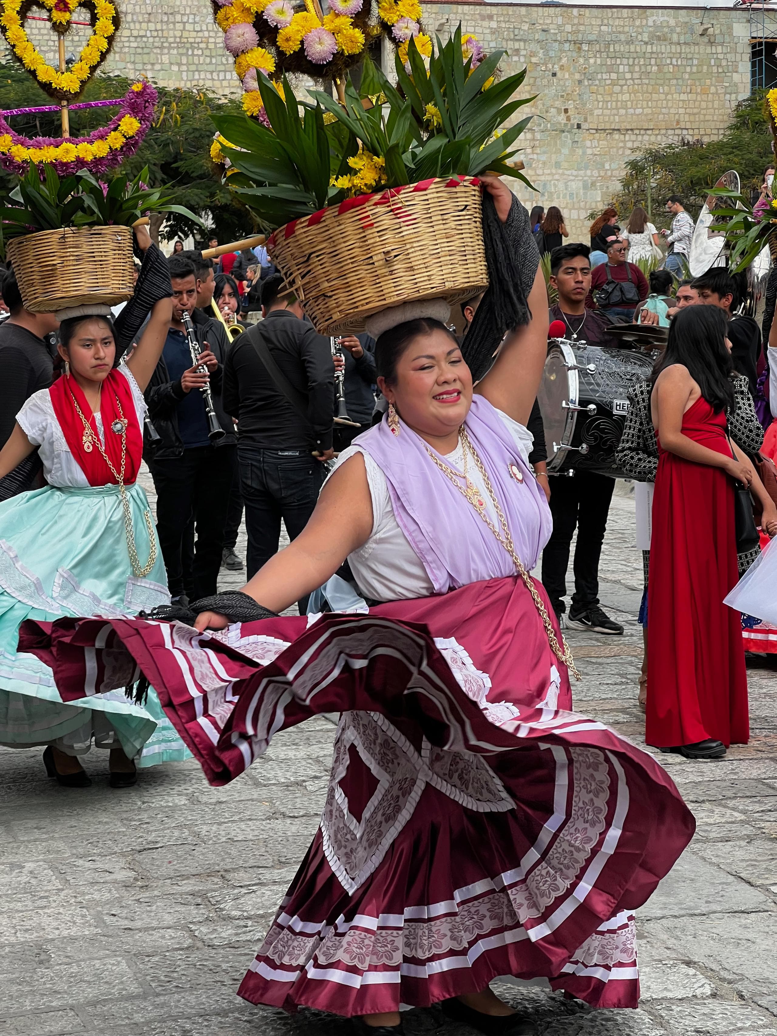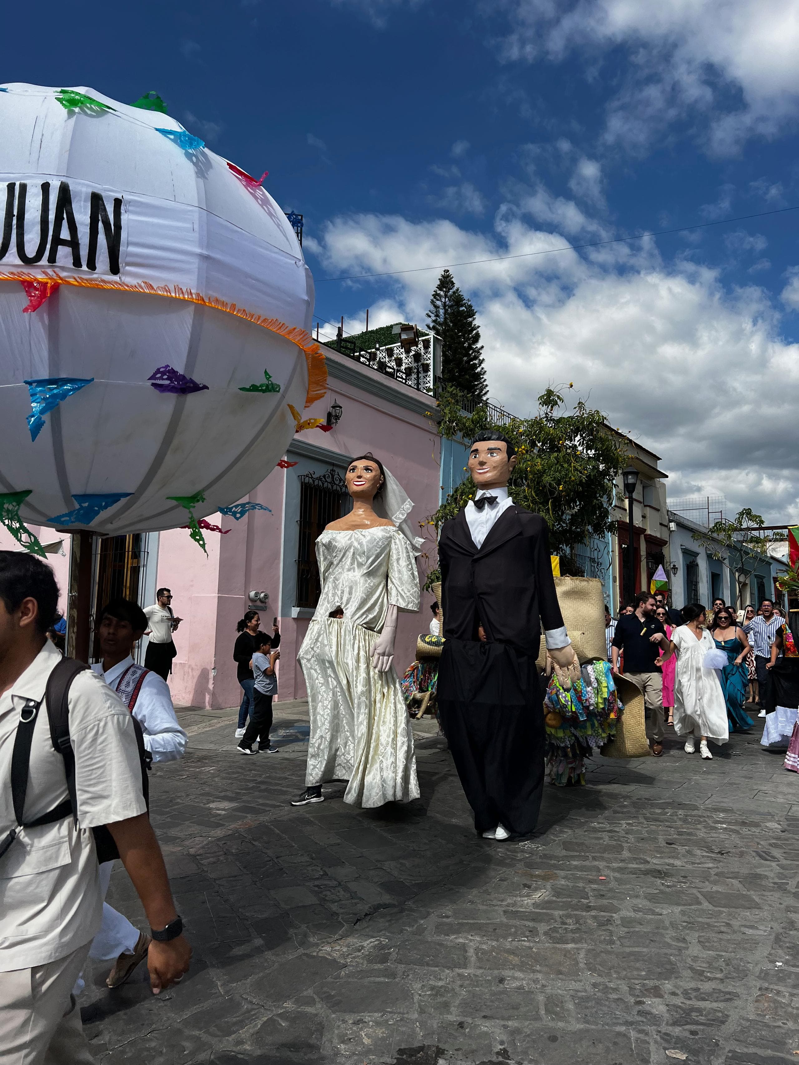 In San Cristobal begegneten uns religiöse Umzüge mit wandelnden Heiligenstatuen und einer Vielzahl von Santa Maria de Guadalupe Figuretten. In Merida waren es tausende Reihen marschierender Kinderschulklassen die stolz das jeweilige Wappen der Schule oder Institution präsentierten und in Oaxaca waren es die Hochzeiten, die zwar schon tagsüber die Straßen unsicher machten aber dann Nachts gar nicht mehr aufhörten. An einem normalen Tag konnte man in Oaxaca alle zwei Stunden eine neue Hochzeitsprozession beobachten bei der große, hübsch angezogene Pappmaschee-Figuren vor dem Brautpaar durch die Gassen tanzten. Ohnehin hatten alle diese Prozessionen das gemeinsame Tanzelement. Da wird gesteppt und geschwungen, gesprungen und gedreht, alles mit einem Lächeln im Gesicht, das selbst den übermüdeten Reisemündern unserer beiden Deutschen ein Lächeln ins Gesicht zauberte.