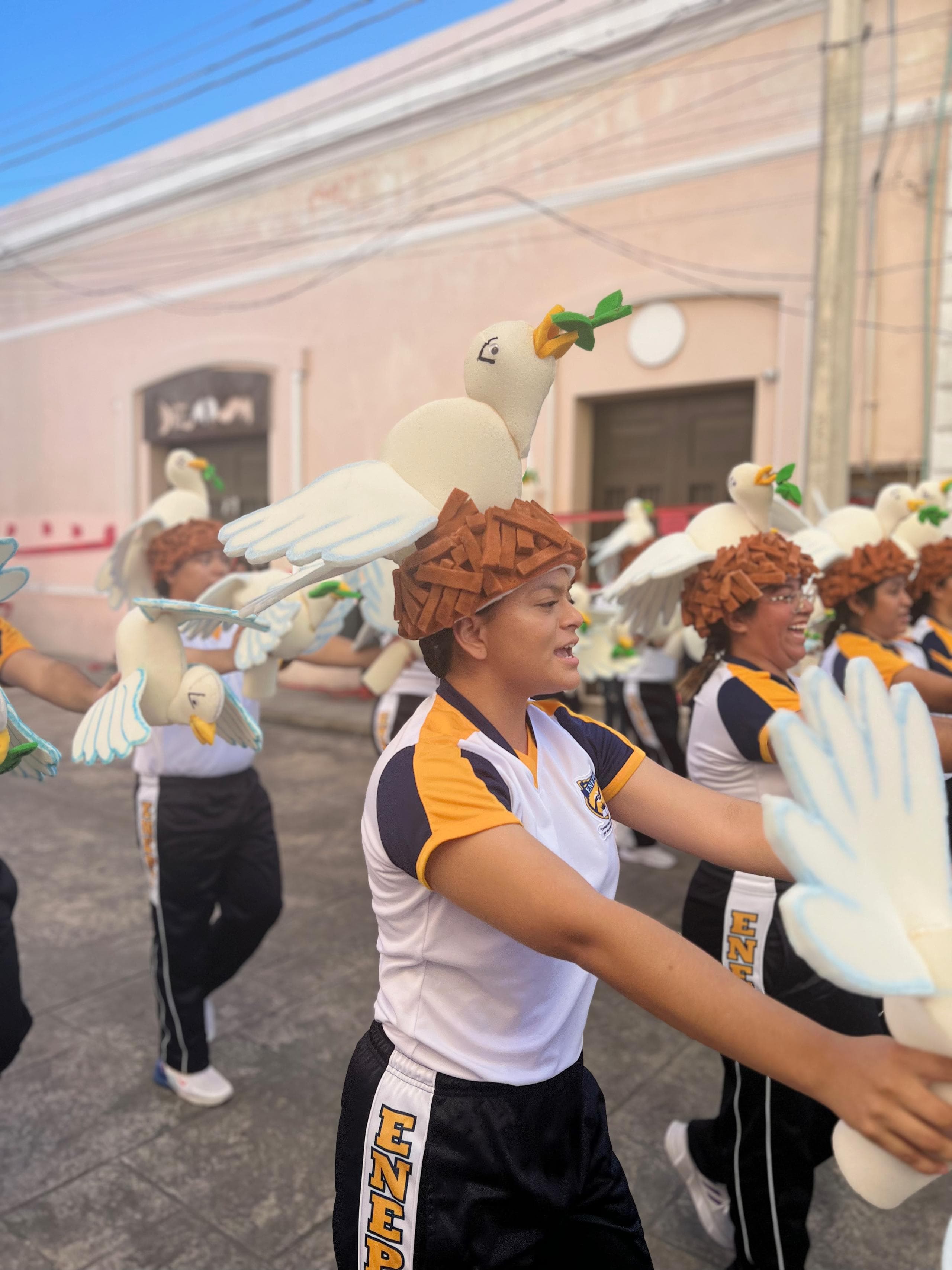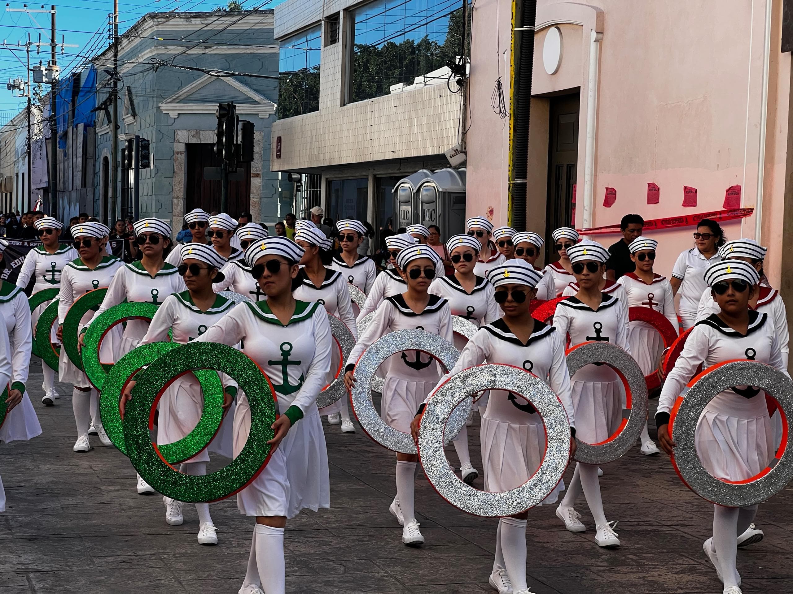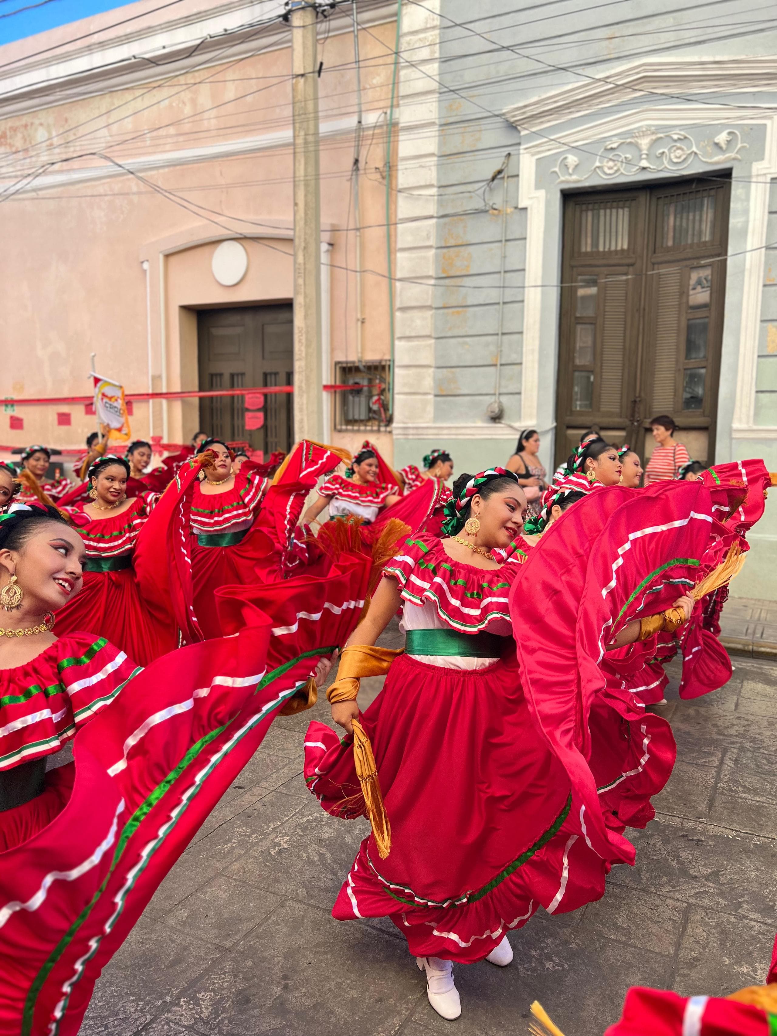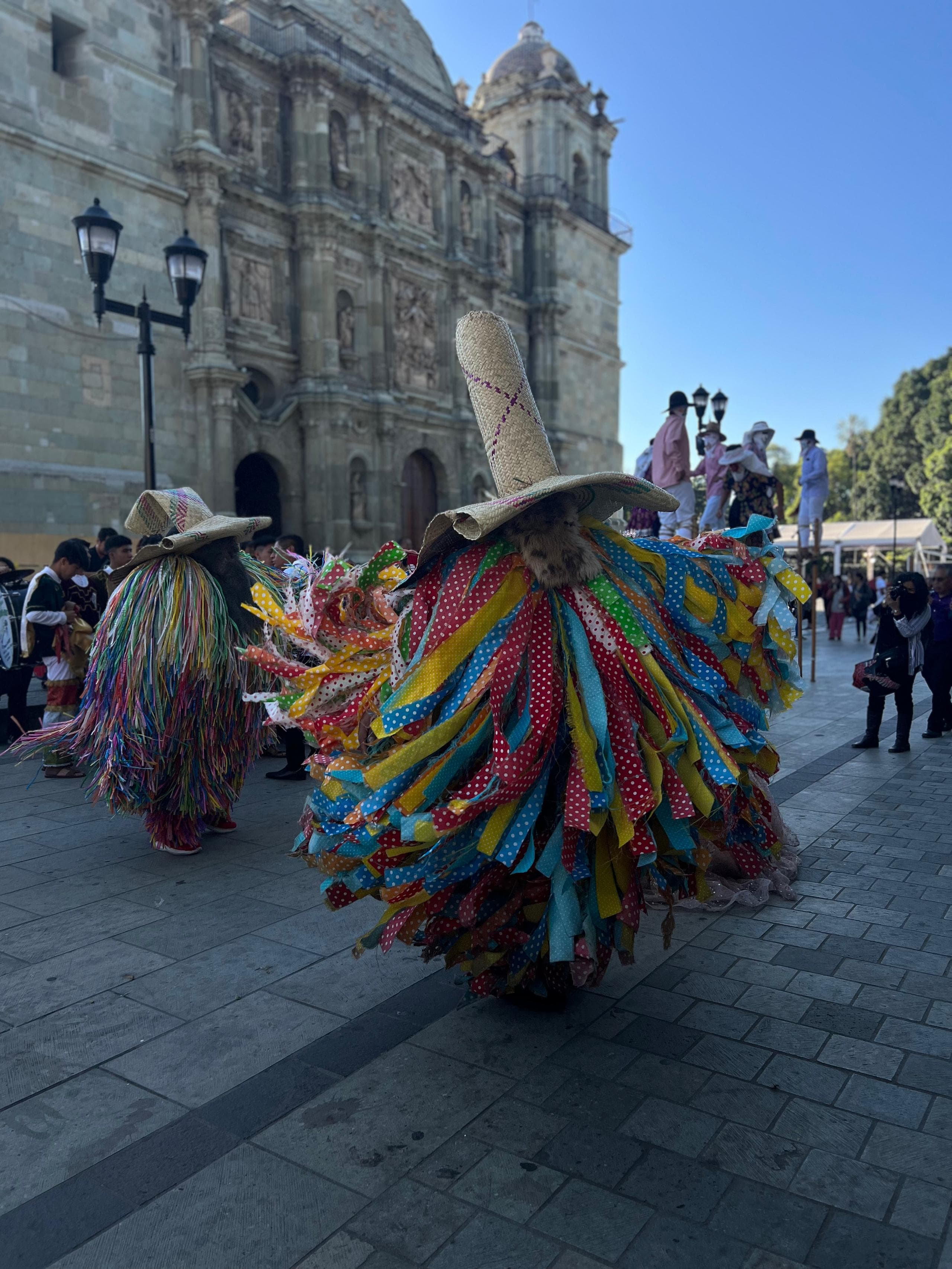 In San Cristobal begegneten uns religiöse Umzüge mit wandelnden Heiligenstatuen und einer Vielzahl von Santa Maria de Guadalupe Figuretten. In Merida waren es tausende Reihen marschierender Kinderschulklassen die stolz das jeweilige Wappen der Schule oder Institution präsentierten und in Oaxaca waren es die Hochzeiten, die zwar schon tagsüber die Straßen unsicher machten aber dann Nachts gar nicht mehr aufhörten. An einem normalen Tag konnte man in Oaxaca alle zwei Stunden eine neue Hochzeitsprozession beobachten bei der große, hübsch angezogene Pappmaschee-Figuren vor dem Brautpaar durch die Gassen tanzten. Ohnehin hatten alle diese Prozessionen das gemeinsame Tanzelement. Da wird gesteppt und geschwungen, gesprungen und gedreht, alles mit einem Lächeln im Gesicht, das selbst den übermüdeten Reisemündern unserer beiden Deutschen ein Lächeln ins Gesicht zauberte.