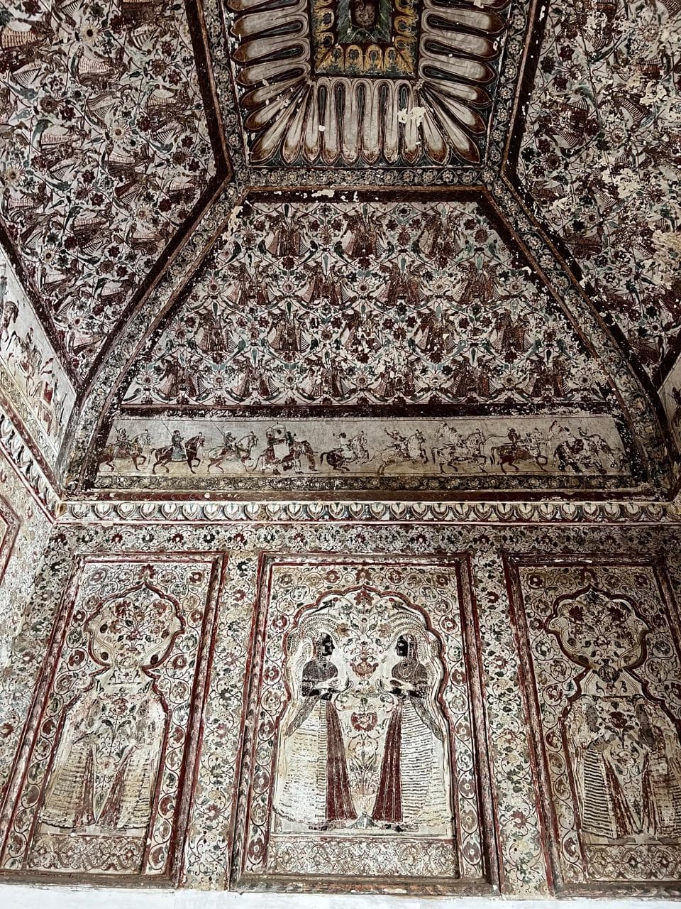 Da ist zum Beispiel das Orchha Fort, der Hauptsitz des Königs. Einladend heißen die großen Eichentore ihre Gäste mit massiven Stahl-Stacheln willkommen. Angebracht um das Rammen von Kriegselefanten zu verhindern verfehlen sie auch heute ihre Funktion als Affenleiter nicht. So hereingebeten betritt man im Anschluss gleich eine Reihe Paläste die auf den ersten Blick völlig unbedeutend aussehen. Blanke Steinwände und eine schlichte Tür verheißen wenig Prunk. Doch sobald wir den Innenraum des Raja Mahal betreten wird die Genialität der Architekten schnell ersichtlich. In einem mehrstöckigem, quadratischen Gebäude mit Innenhof erstrecken sich in alle Sichtlinien Symmetrien und wunderschön verzierte Torbögen. Jedes Tor, jeder Turm und jede Kuppel scheinen genau am richtigen Platz und verstärken nur das Bild eines meisterhaft geplanten, majestätischen Wohnraums. Alles zentriert sich auf das private Leben im Innern, jedes Detail bringt Gemütlichkeit und Pracht zur Geltung. Die Innenräume zeugen noch heute mit ihren fantastischen Wandmalereien von lange vergangener Kunstfertigkeit, die Fenster brachten Licht und Wärme in eine Zeit, die zumindest für die 4-5 Konkubinen des Herrschers sicher nicht immer einfach war. Karierte Fenster und verdeckte Gänge zeugen von einem versteckten Leben, denn es war nur sehr wenigen Augenpaaren gestattet die Frau(en) des Herrschers zu betrachten. Besonders interessant fanden wir auch die völlige Abwesenheit von Treppen, zumindest auf den ersten Blick. Jede Möglichkeit in ein anderes Stockwerk aufzusteigen war so perfekt versteckt, dass kein Besucher von müsahm aufsteigenden, alten Königen belästigt werden konnte. Selten war unser Treppensteigen so privat.