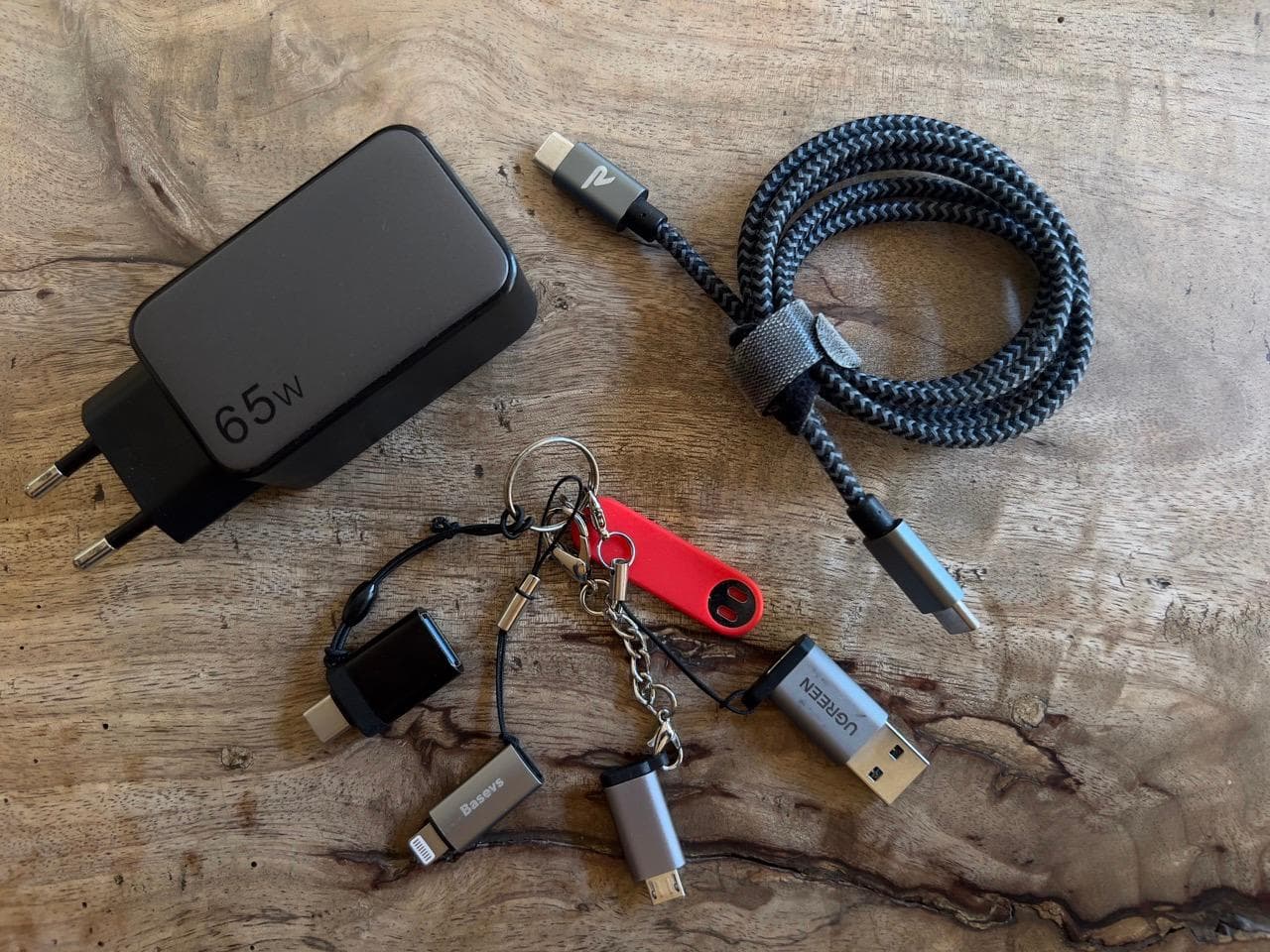 Wir haben versucht, die Anzahl der verwirrenden Kabel auf ein Minimum zu reduzieren, so dass gar nicht erst ein Chaos entstehen könnte. Das Herzstück unseres Setups sind 3 identische USB-C Kabel und ein 65 Watt Netzstecker mit mehreren USB-C Steckplätzen für die Steckdose. Das mit dem Watt ist mir auch nicht so ganz klar, aber es scheint bei kleiner Größe auszureichen um ein MacBook Air oder ein paar andere Geräte schnell aufzuladen. Für alle anderen Geräte haben wir nur noch Adapter die auf ein USB-C Kabel aufsteckbar sind. Es gibt also ein USB-C / Micro-USB Adapter, einen für das iPhone usw. Der riesige Vorteil ist, dass wir nur eine Art von Kabel haben das wir dann in alle möglichen anderen „verwandeln“ können. Kein Kuddelmuddel, keine lange Suche nach dem „Foto-Kabel“ oder Ähnliches. Wir nutzen die Kabel neben dem Laden auch für unsere Festplatte, die Datenübertragung vom Handy aus und natürlich als Kletterseile.