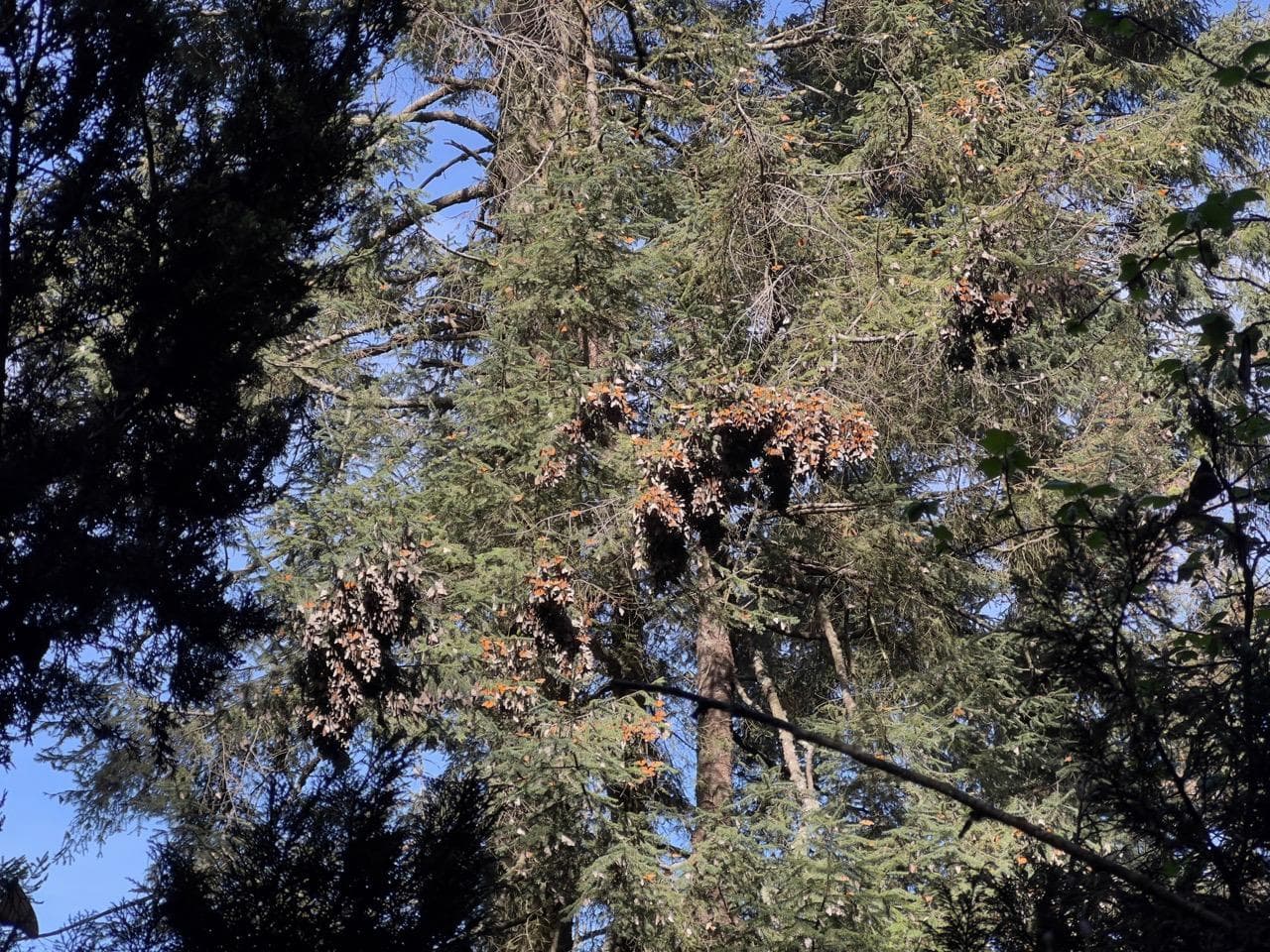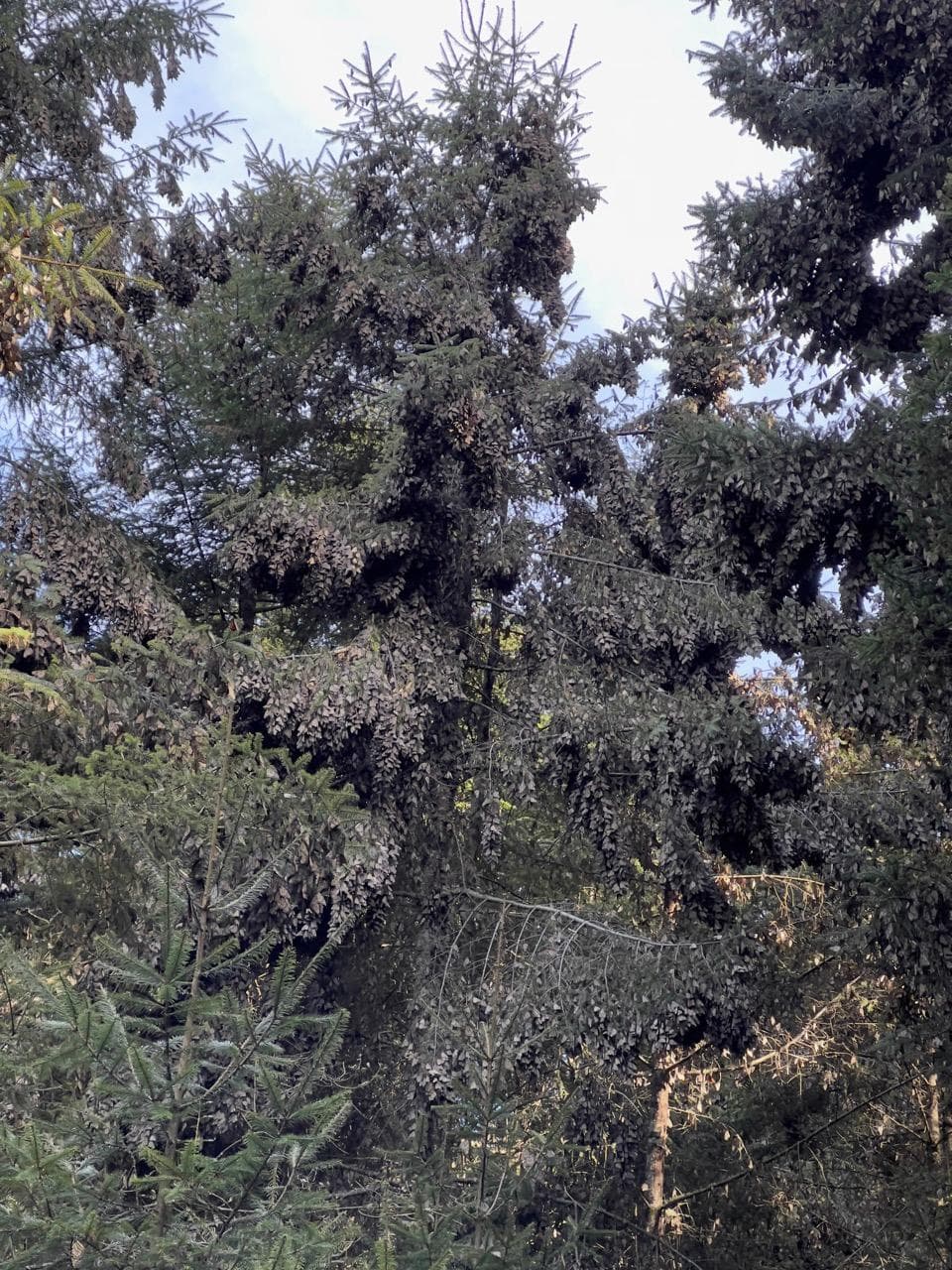 Nach weiteren 30 Minuten wurde das Dickicht der Tannen um uns herum immer dichter, die Schatten trotz der langsam steigenden Sonne immer dunkler und als wir dann das Ende unseres Pfades erreichten bewegte sich im dunklen Geäst der hohen Bäume mehr als zu erwarten gewesen wäre. Dort oben, an den dünnen Spitzen der Tannen hingen große Ballen voller Blätter, leise raschelnd im Wind. Doch Moment Mal! Zuersteinmal waren das hier Tannen und an jenen wäre ein einzelnes Blatt schon zu viel doch viel verwunderlicher war die Bewegung jener Blätter, welche ein ums andere mal orangefarben aufleuchteten, sich wendeten und dann wieder dunkel vor sich hin schliefen. Denn die Blättertrauben die da über uns hingen waren überhaupt keine Blätter, vielmehr waren es abertausende Schmetterlinge die sich dort gegenseitig im tiefen Frostschlaf einander wärmten. Denn dieser Wald dort hoch oben ist das Ziel von Millionen von Monarchfaltern die dort schon seit Jahrhunderten immer wieder überwintern. Eine Geschichte, die faszinierender nicht sein könnte und die sich hier oben, in dieser frischen und dünnen Luft vor unseren Augen entfaltete.