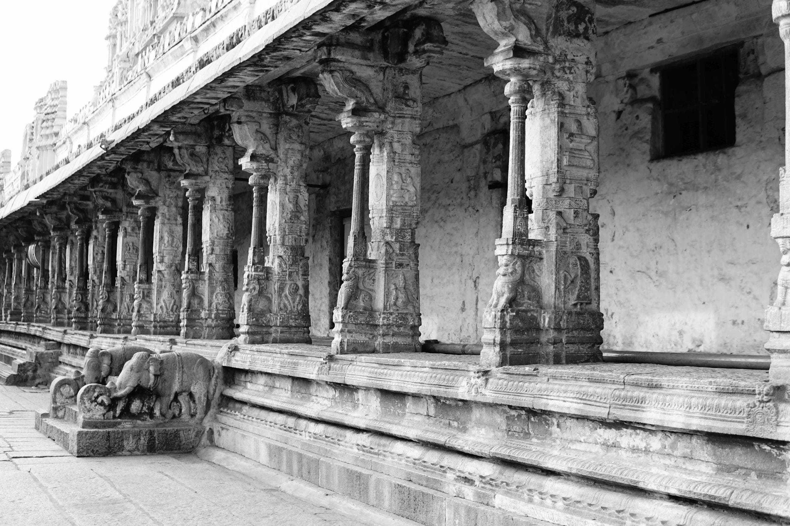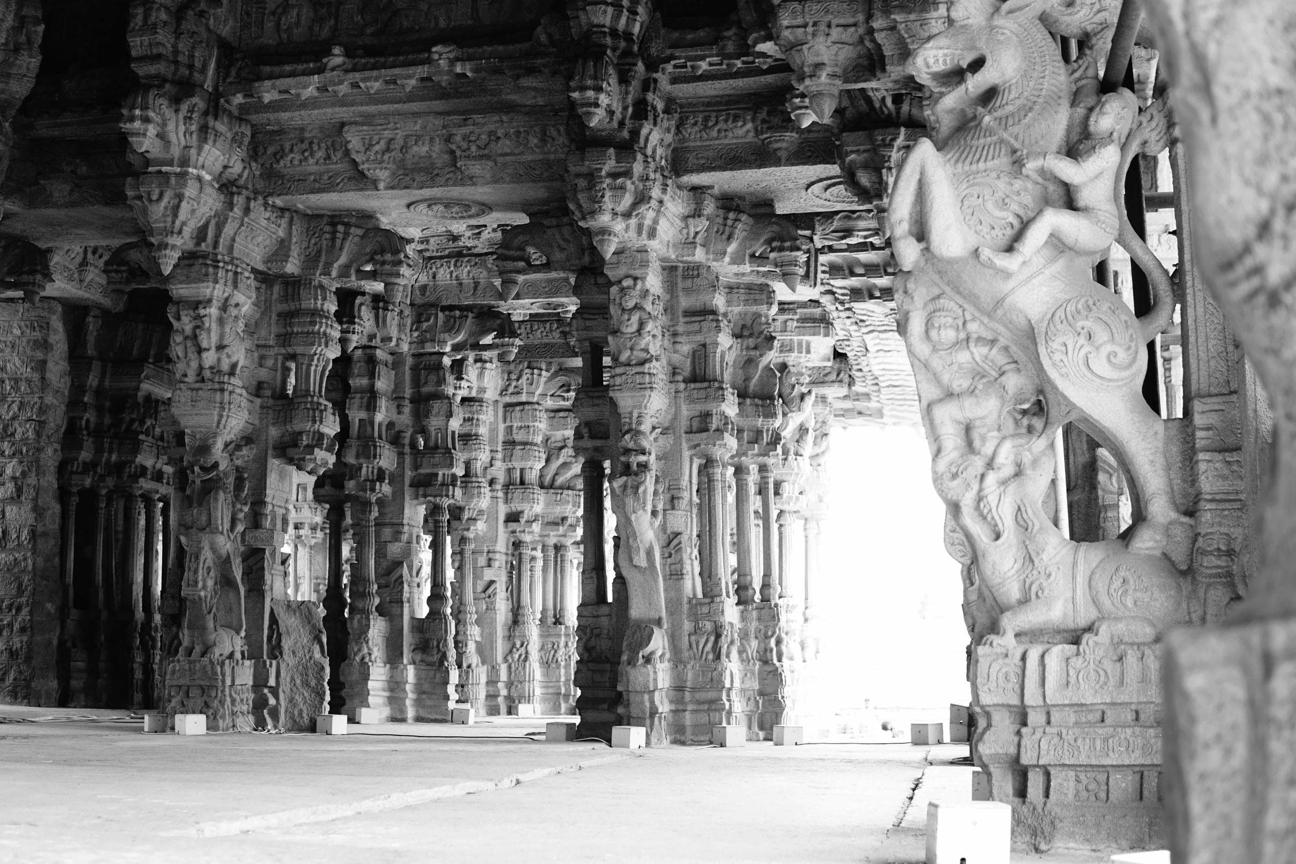 Aber diese Überbleibsel sind es wert, die eher beschwerliche Reise auf sich zu nehmen um nach Hampi zu kommen. Wir konnten uns lange nicht satt sehen an den uns so unbekannten Statuen und den Jahrhundertealten Tempeln. Ganz eigen hebt sich der Baustil von allem ab, was wir sonst schon betrachten konnten. So sind in vielen Tempeln die bis ins Detail verzierten Säulen mehrteilig aufgebaut, und scheinbar so geformt, das jede Säule beim Schlag mit der Hand einen anderen Ton von sich gibt. So entstanden in der Metropole zu Feierlichkeiten ganz eigene Kunstwerke religiöser Musik, die sicher eindrücklich durch die unterschiedlichen Täler schallten. Mittlerweile ist es allerdings bei den meisten Anlagen verboten, auch nur in die Nähe einer Klangsäule zu kommen. Vermutlich, um die Säulen vor den nicht minder motivierten selbsternannten Säulen-Musikern zu schützen, die wir immer wieder beobachten konnten.