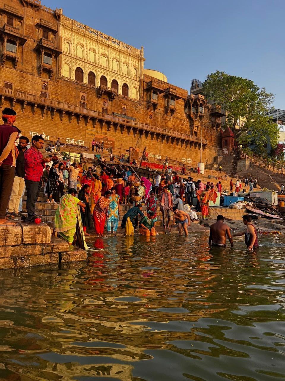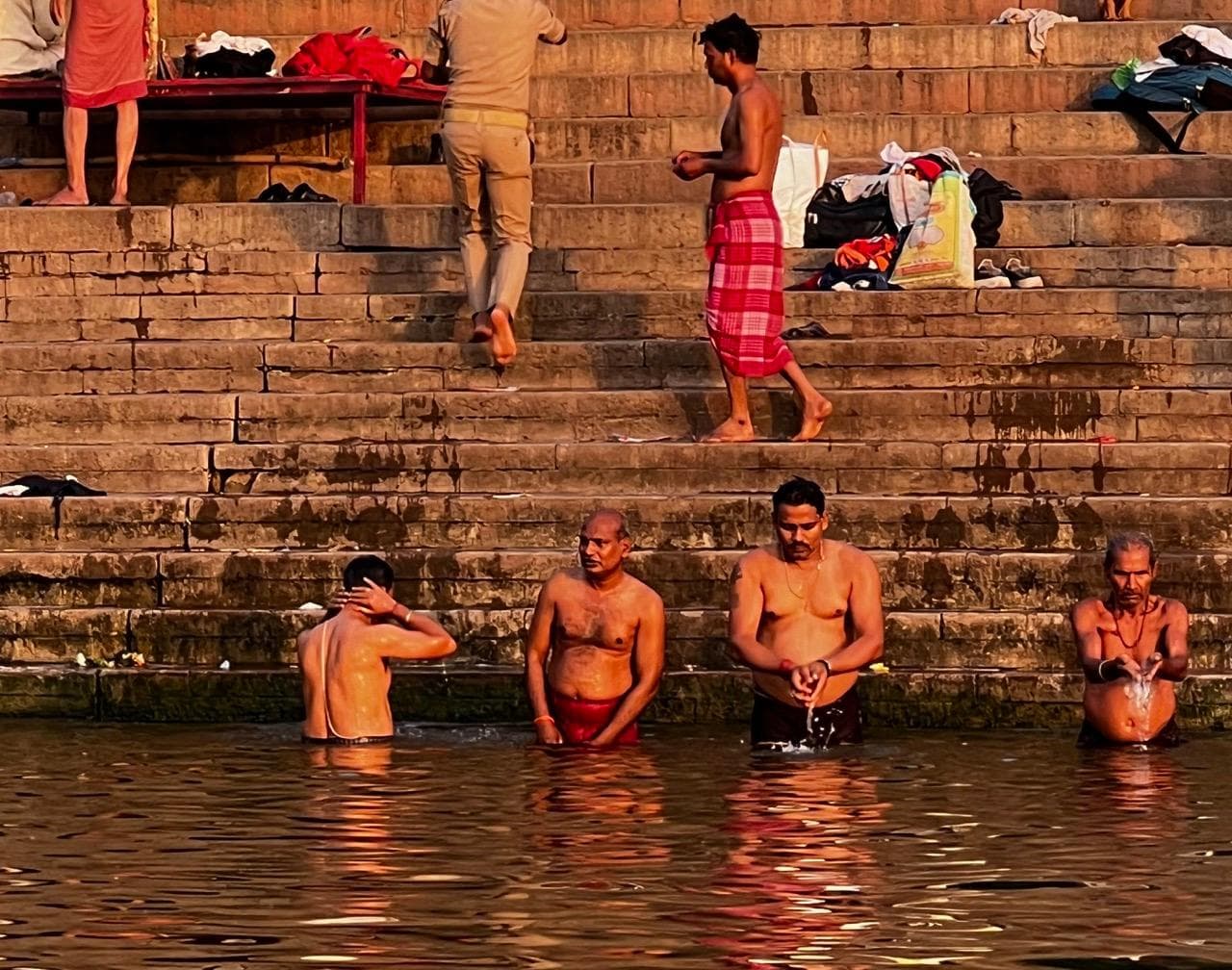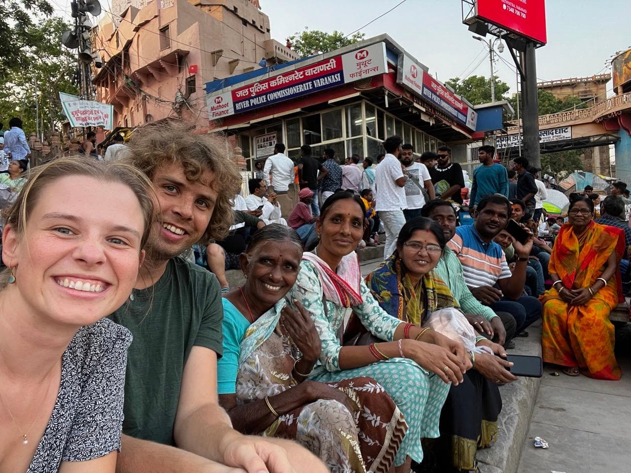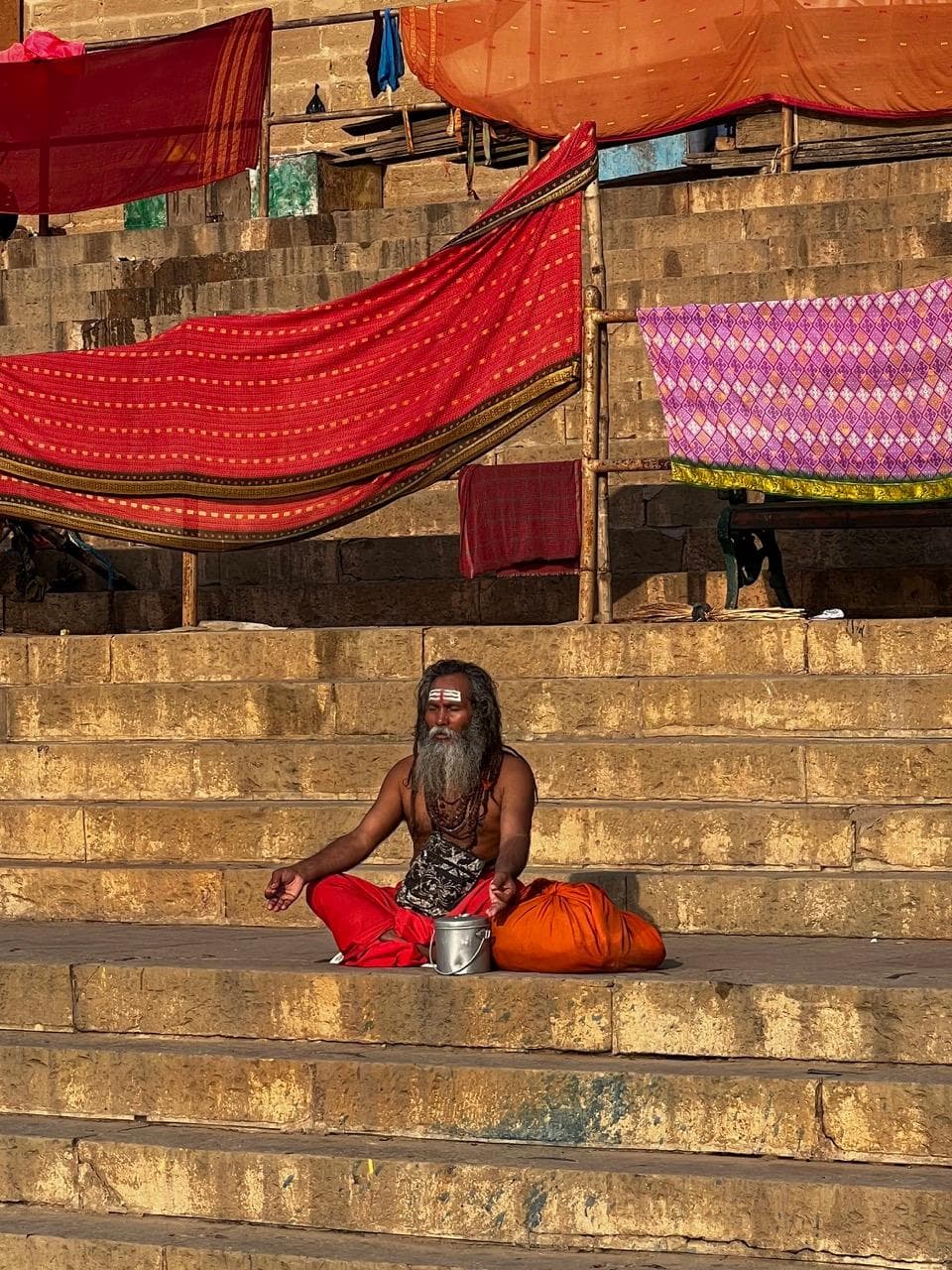 Schon hupt der nächste Motorradrabauke hinter uns, will vorbei und versucht sein Glück in der kurz aufklaffenden Lücke zwischen Kuh und dem alten, bärtigen Mann mit Bettelbüchse. Geplättet von den Eindrücken und der Nachtzugfahrt aus Kalkutta stehen wir etwas verloren in dieser engen Gasse von Varanasi. DEM Varanasi, dem heiligen Ort des Hinduismus, dem Zentrum aller Indien-Dokus und dem Pilgerort für so viele Hindus aus der ganzen Welt. Varanasi ist eine der am längsten durchgängig bewohnten Städte der Welt, schon vor tausenden Jahren wurden hier vermutlich Leichname verbrannt, wurden Tempel errichtet und zweifelhafte Bäder in noch zweifelhafteren Hygienebedingungen im Ganges genommen. Menschen kommen hier her um zu sterben, denn wer hier stirbt hat wohl eine höhere Chance dem ewigen Kreislauf von Tod und Reinkarnation zu entkommen. Menschen kommen aber auch hier her um Indien zu erleben, um zu beten, um zu baden oder, wie in unserem Fall, um sich komplett von Indien überwältigen zu lassen. Schon nach wenigen Minuten glich unsere Tour durch die enge Altstadt Varanasis einem Traum. Ich bin mir im Nachhinein auch nicht mehr sicher was ich wirklich alles gesehen habe, so stark, so übertrieben und so schnell kam Varanasi auf mich zu. Meine Augen finden einfach keine Ruhe, streifen über die bettelnden Kinder, über die religiösen Rituale und unzähligen Tempelchen am Wegesrand, verweilen hungrig an einem Straßenstand in dem irgendetwas vegetarisches neben einem verlockend riechendem Curry serviert wird. Sie versuchen gleichzeitig die Überflut an Menschen zu verstehen, den Verkehr in Schach zu halten, Maren nicht zu verlieren, Straßenkunst zu begutachten und den Weg zum Ufer zu finden. Es ist einfach eine völlige Reizüberflutung die mich da trifft, haben wir uns mit Indien und Varanasi vielleicht doch ein bisschen zu viel vorgenommen? Wo ist der ruhige Strand Thailands hin? Was ist mit den friedlichen Tiefen des Meeres? Was mache ich hier, das ist einfach VIEL ZU LAUT!