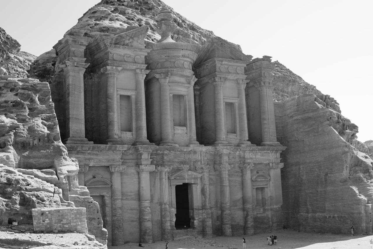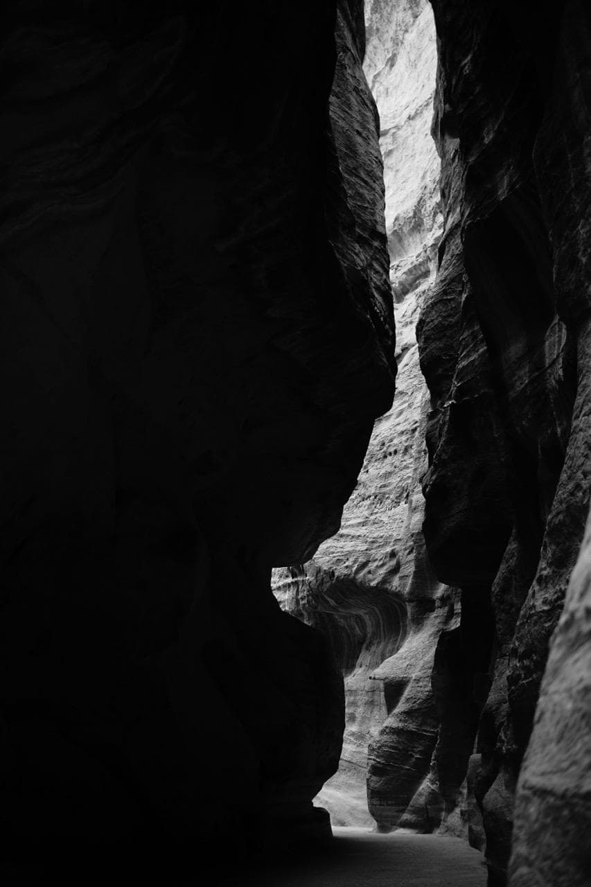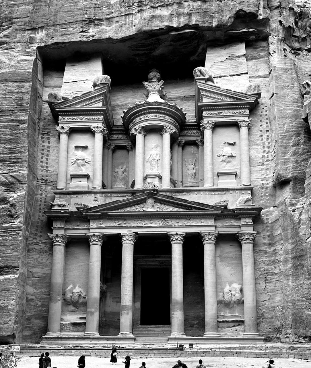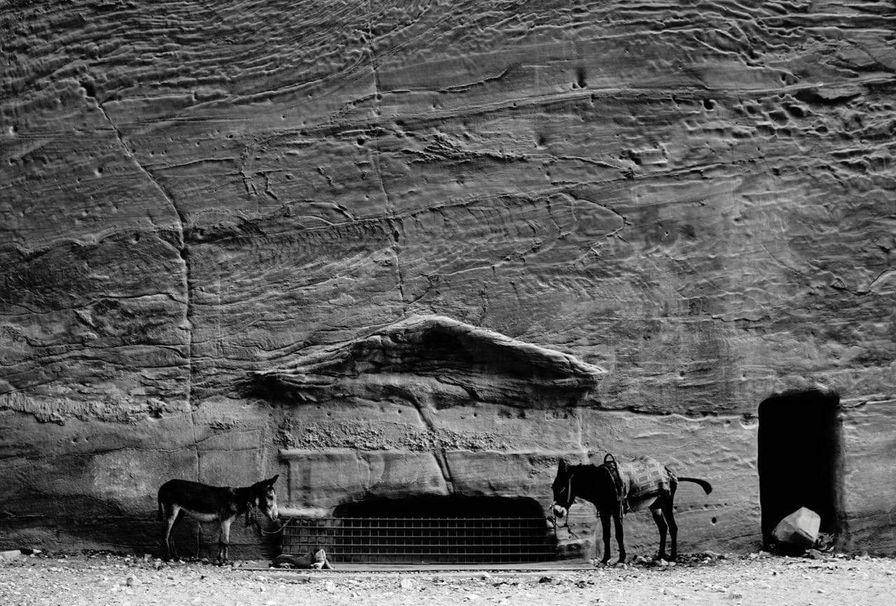 So schlängeln wir uns denn auch, noch etwas verschlafen, das kilometerlange Zugangstal in die Stätte hinein. Begleitet von den Überresten eines ehemals genialen Wasserleitungssystems das den Nabatäern es erst ermöglichte, bis zu 30.000 Menschen an diesem eher unwirtlichen Ort zu beherbergen. Vor jeder Biegung erwarten wir schon das bekannte Schatzhaus, die sicher berühmteste Fassade der Stadt. Aber stattdessen werden wir immer wieder überrascht von neuen, noch beeindruckenderen Felsspalten und ersten, noch meist kleinen, Felsbearbeitungen. Die Landschaft um Petra wäre es schon für sich wert, hier mehrere Tage zu verweilen. Zu allen Seiten türmen sich rote Sandsteinfelsen empor, stilvoll umrahmt von gelegentlichen grünen Büschen. Da fällt es selbst mir, als alten Schwarz-Weiß-Fetischisten, nicht schwer auch ab und zu ein bisschen Farbe durch die Kameralinse träufeln zu lassen.