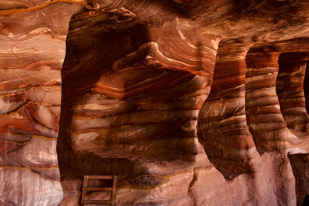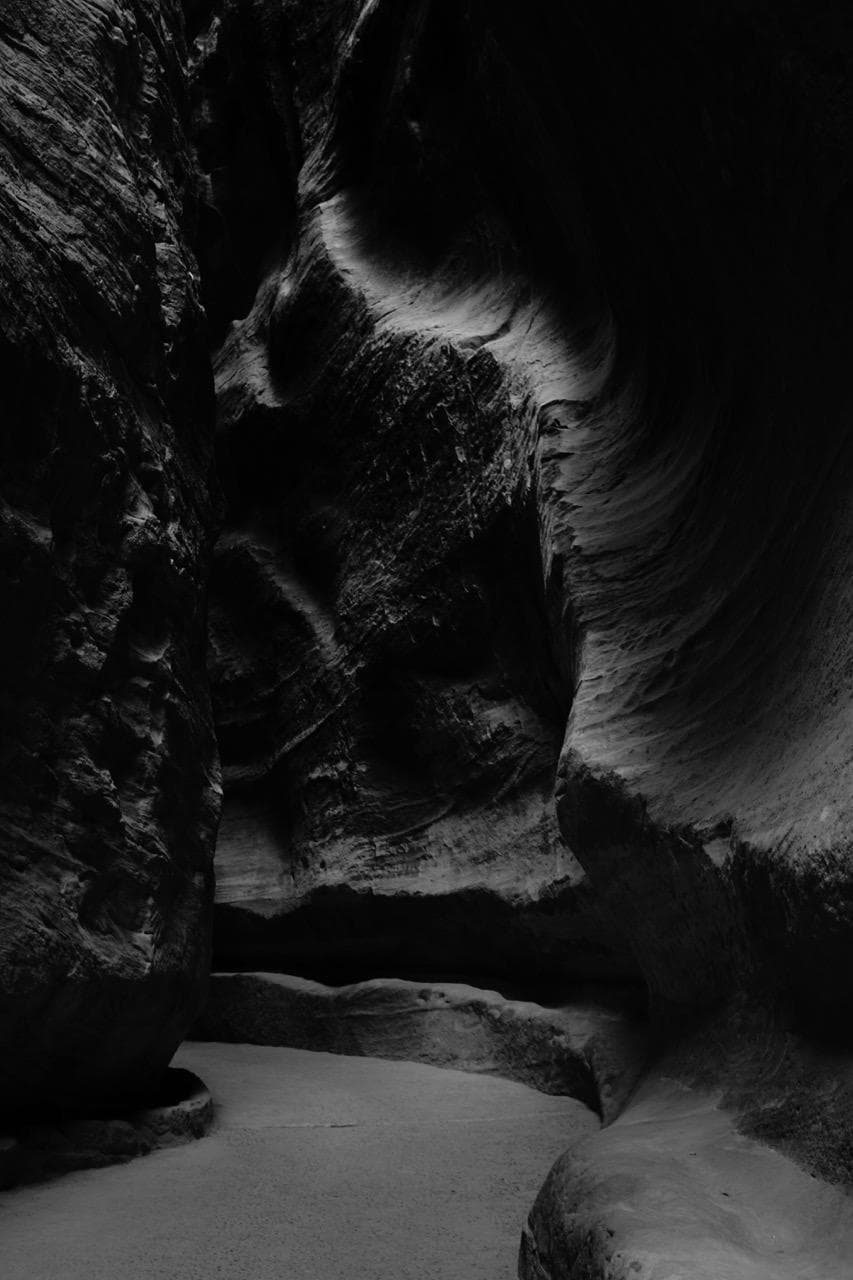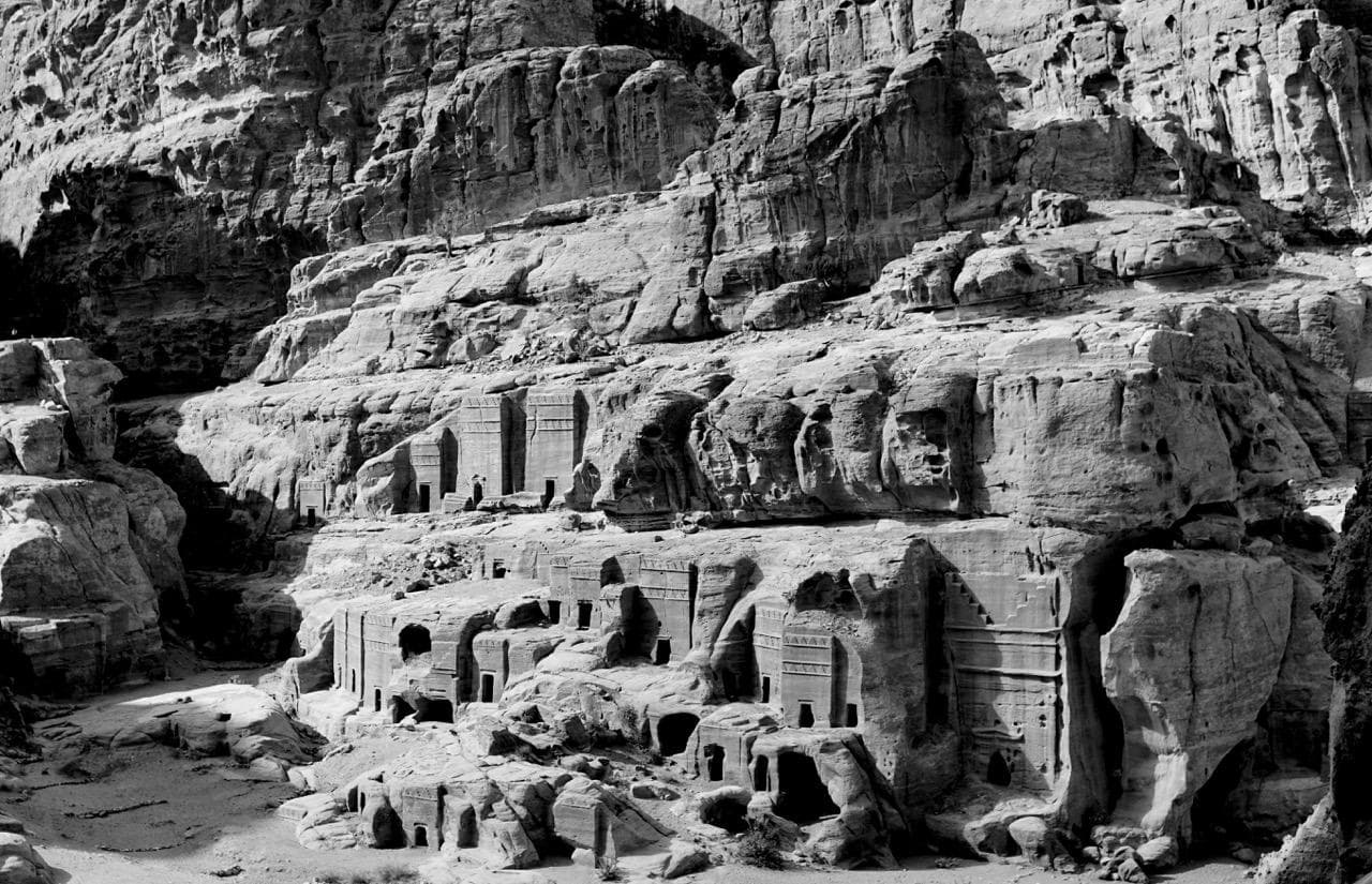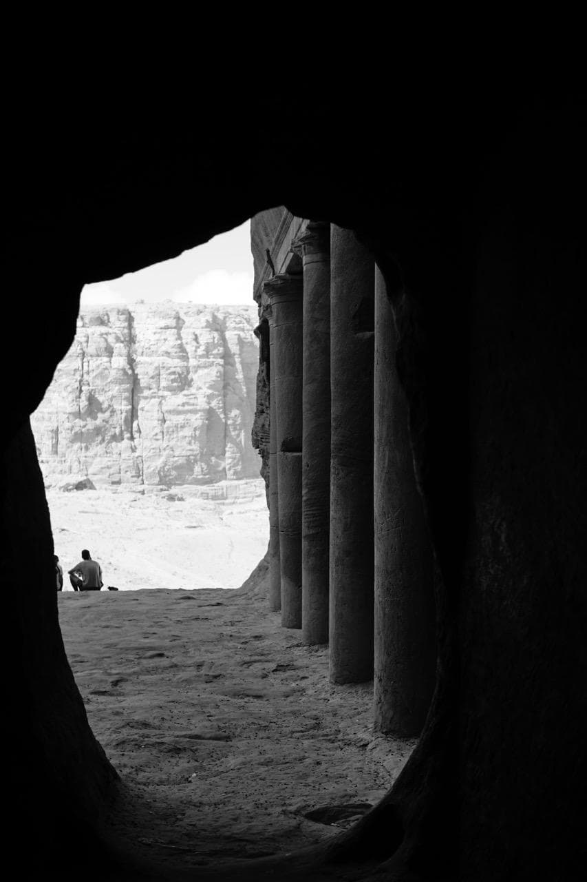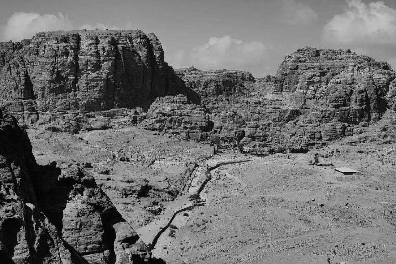 So schlängeln wir uns denn auch, noch etwas verschlafen, das kilometerlange Zugangstal in die Stätte hinein. Begleitet von den Überresten eines ehemals genialen Wasserleitungssystems das den Nabatäern es erst ermöglichte, bis zu 30.000 Menschen an diesem eher unwirtlichen Ort zu beherbergen. Vor jeder Biegung erwarten wir schon das bekannte Schatzhaus, die sicher berühmteste Fassade der Stadt. Aber stattdessen werden wir immer wieder überrascht von neuen, noch beeindruckenderen Felsspalten und ersten, noch meist kleinen, Felsbearbeitungen. Die Landschaft um Petra wäre es schon für sich wert, hier mehrere Tage zu verweilen. Zu allen Seiten türmen sich rote Sandsteinfelsen empor, stilvoll umrahmt von gelegentlichen grünen Büschen. Da fällt es selbst mir, als alten Schwarz-Weiß-Fetischisten, nicht schwer auch ab und zu ein bisschen Farbe durch die Kameralinse träufeln zu lassen.