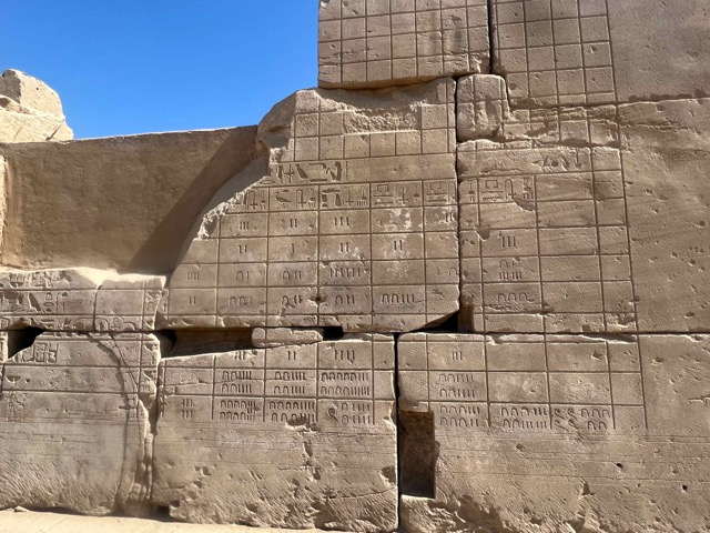 Im Karnak Tempel (Ja, das ist schon etwas länger her) sind wir dank unserem Ägyptologen auf diese ägyptische Rechentabelle aufmerksam geworden. Nach einer kurzen Einführung in das Hieroglyphen-Zahlensystem war schnell klar, wer der wahre Erfinder des tabellengestützten Rechenchaos war. Ramses II, Pharao der 18. Königsdynastie. Voller Liebe haben die Ägypter hier eine Rechnung nach der Nächsten verewigt. Genau wie in moderner Notationsweise mit Reihen, Spalten, Spalten-Summen und sogar einer Gesamtsummierung. Da kommt ja jeder Bürohengst automatisch ins Schwärmen.