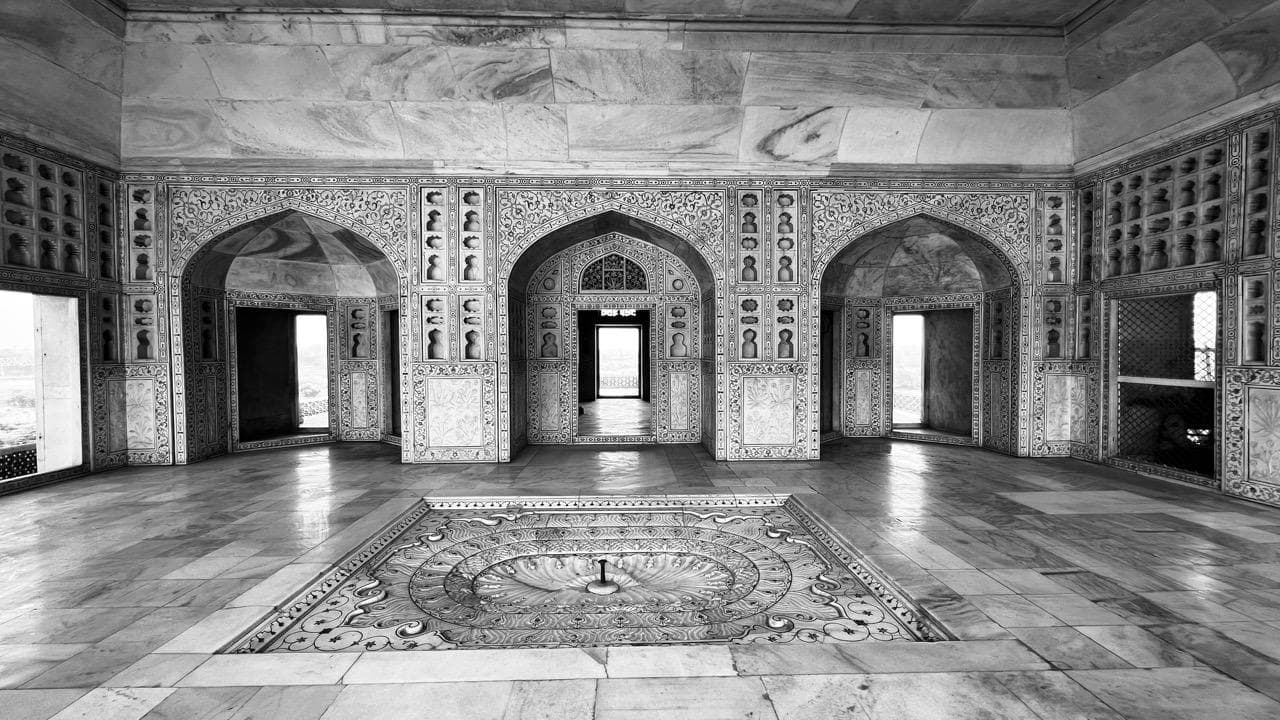 An diesem ersten Tag besuchten wir natürlich NICHT den Taj Mahal, denn so blöd sind wir dann auch nicht, noch nach 9 Uhr auf so ein Highlight zu gehen und vermutlich mit allen Touri-Bussen gleichzeitig zum Taj zu rennen. Also entschieden wir uns, das berühmte “Rote Fort” zu besuchen. Die Bezeichnung Rotes Fort ist zwar ziemlich unaussagekräftig, denn immerhin sind eigentlich alle Forts die wir in Indien besucht haben mit rotem Sandstein gebaut worden, doch die Burg selbst war eigentlich ein schöneres Exemplar der Stein auf Stein gebauten Machtprotzerei. Zwischen gigantischen Türmen und wundervoll islamisch verzierten Eingangsflügeln hindurch ging es zur Abwechslung mal nicht 100 Meter in die Höhe sondern einfach nur hinein in einen Burghof, der ziemlich verschachtelt und verziert und außergewöhnlich unbesucht war. Hier und da gab es ein paar Reisegruppen voller Luxemburger die durch die Gänge streiften und ab und zu gab es eine Indische Familie die mit uns Selfies schoss. Das Highlight der Burg war ihr marmorner Palastbereich. Überaus kunstvoll schmiegte sich eine Reihe kleinerer Gebäude an die Außenwand der Burg und formte mehrere wundervolle, perfekt ausgerichtete Ruheräume. Die islamische Kunst Indiens demonstrierte hier mal wieder beeindruckend, wie plump europäische Burgen zu ähnlichen Zeiten erbaut wurden. Herrlich symmetrische Raumaufteilungen, bis ins kleinste Detail liebevoll ausformulierte Intarsienarbeiten und vieles Weiteres. Man kann sich so richtig vorstellen, wie entspannend es hier sein musste, bei einem Glas alkoholfreiem Wein an seinem Zierbecken zu sitzen und sich den Wind zufächern zu lassen während man ein paar hundert Meter weiter die schweißtreibenden Bauarbeiten zum Taj Mahal beobachten konnte.